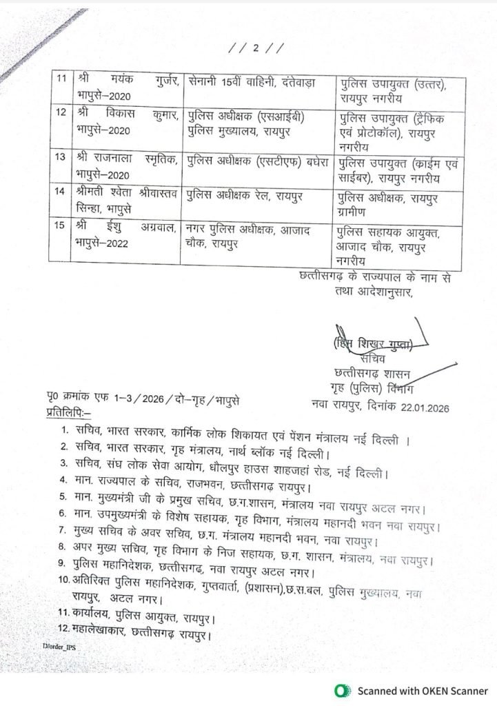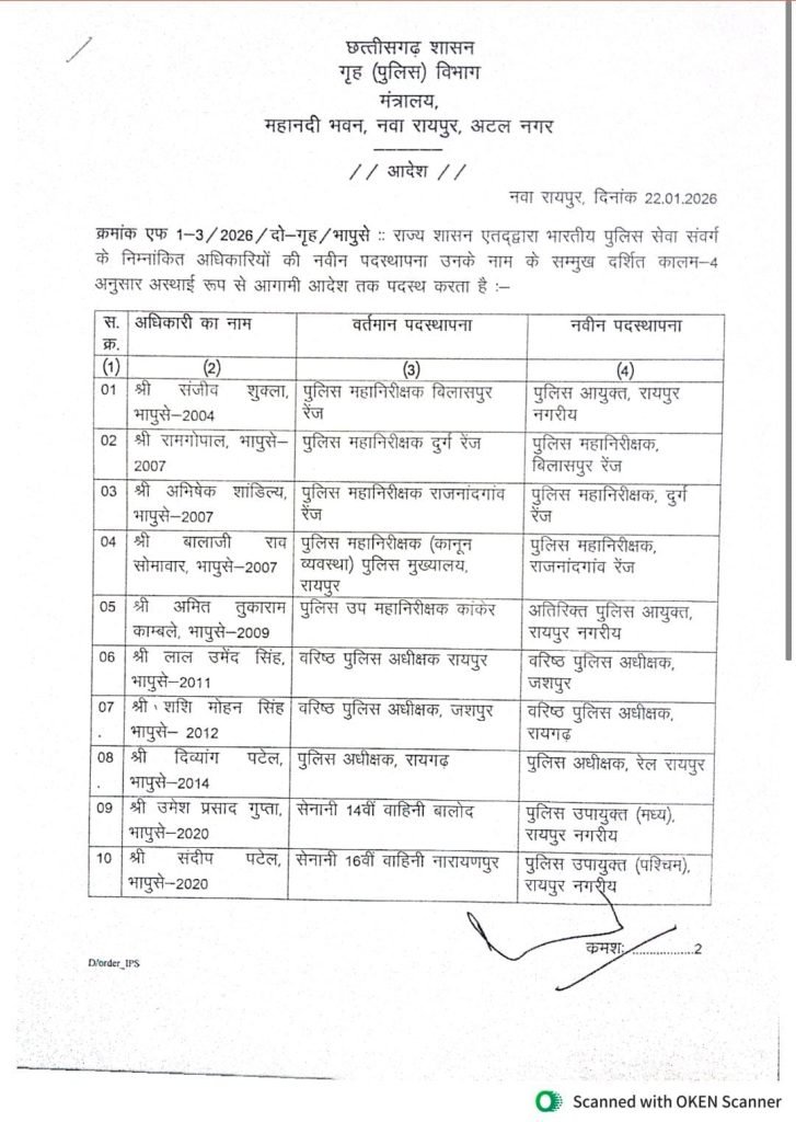 उमेश प्रसाद गुप्ता (IPS-2020) को पुलिस उपायुक्त (मध्य), रायपुर नगरीय, संदीप पटेल (IPS-2020) को पुलिस उपायुक्त (पश्चिम), रायपुर नगरीय और मयंक गुर्जर (IPS-2020) को पुलिस उपायुक्त (उत्तर), रायपुर नगरीय बनाया गया है।